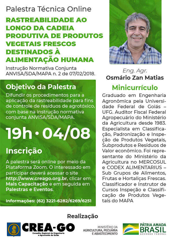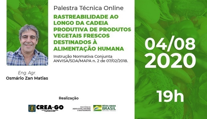 Palestra Técnica Online: Rastreabilidade ao longo da cadeia produtiva de produtos vegetais frescos destinados à alimentação humana - Instrução Normativa Conjunta ANVISA/SDA/MAPA nº 2 de 07/02/2018.