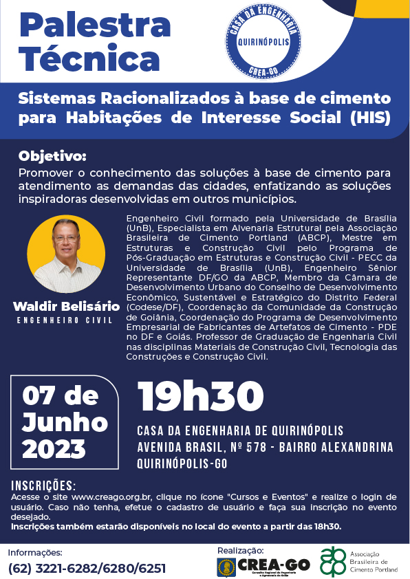 Local: Casa da Engenharia de Quirinópolis - Avenida Brasil, nº 578 - Bairro Alexandrina, Quirinópolis-GO